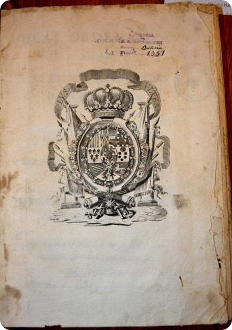| Real Ordenanza para el establecimiento e instrucción de intendentes de exército y provincia en el virreinato de Buenos Aires. Año de 1872 | Lecciones de fisiología dadas por el catedrático de anatomía y cirugía Dr. José María Quiroga escrito por el alumno practicante José María Leonardo Benavidez, colegio general de medicina en La Paz de Ayacucho 1836 | |