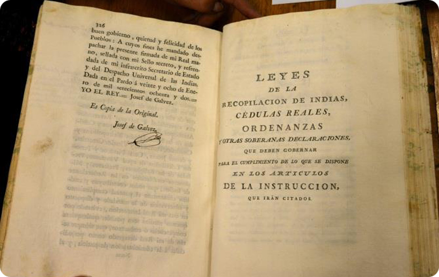 Este ejemplar incluye la portada original con sello Real un anexo de Leyes de la Recopilación de Indias, Cédulas Reales, Ordenanzas declaraciones. Trae extensas glosas, una de ellas menciona al Virrey Theodoro de Croix. Otra de las glosas manuscritas que llama la atención son las decisiones del Intendente Francisco de Paula Sanz y Vicente Cañete.