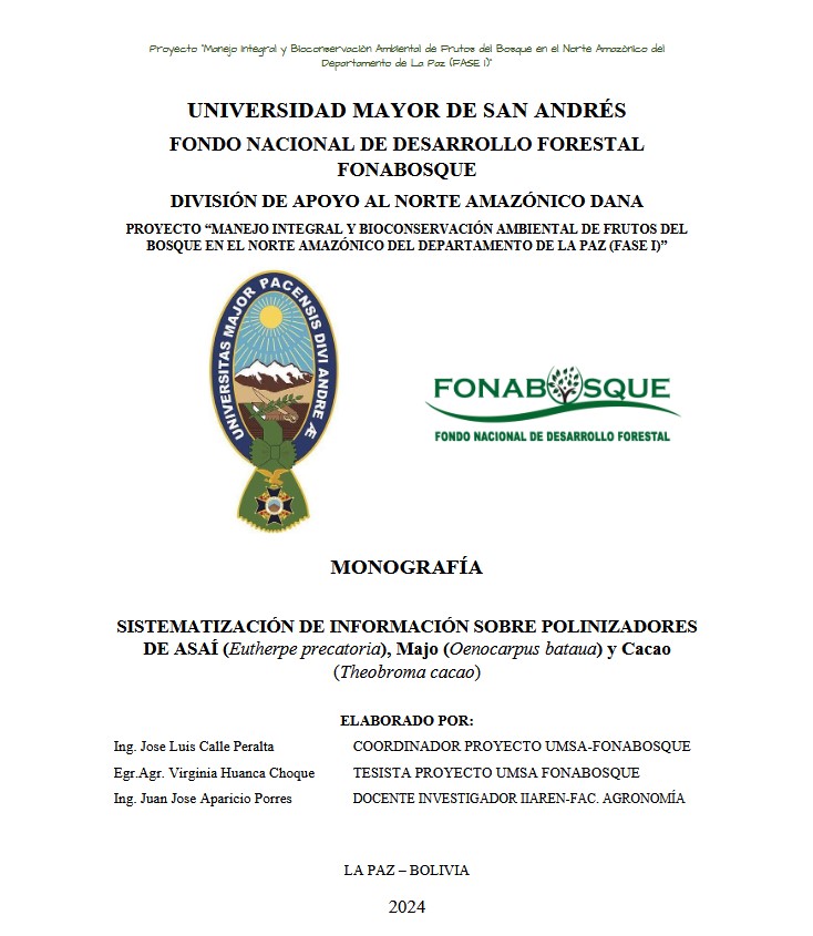 Esta publicación fue posible gracias al financiamiento de la Division de Desarrollo Integral del Norte Amazónico DINA, Programa Intgeral Biológico Turístico Jardin Botanico PIBT-JB, proyecto "Establecimienbto de parcelas demostrativas en sistemas agroforestales multiestratos en la provincia Abel Iturralde". Asímismo, se agradece al personal técnico del DINA/PIBT-JB, Instituto de Desarrollo Regional IDR, Estación Experimental de Sapecho y Laboratorio de Fitopatología de la Carrera de Ingeniería Agronómica de la Facultad de Agronomía.