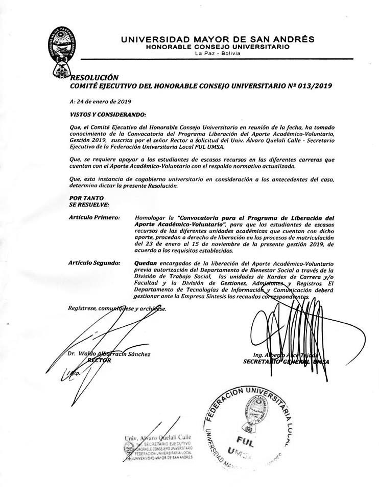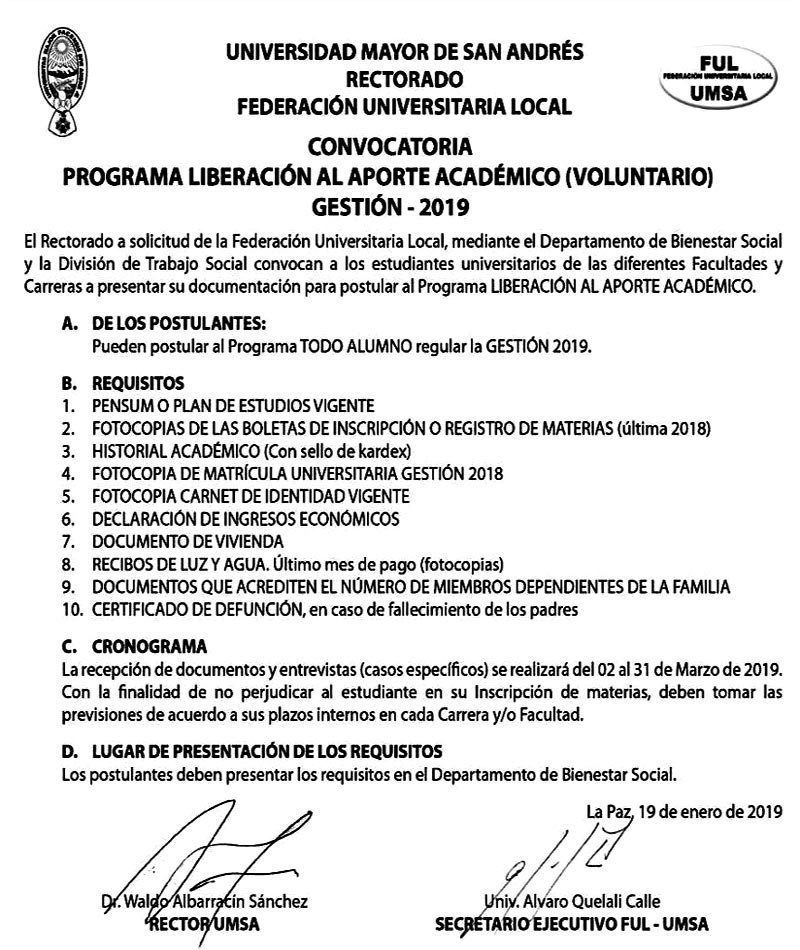 El Rectorado a solicitud de la Federación Universitaria Local, mediante el Departamento de Bienestar Social y la División de Trabajo Social convocan a los estudiantes universitarios de las diferentes Facultades y Carreras a presentar su documentación para postular al Programa LIBERACIÓN AL APORTE ACADÉMICO: