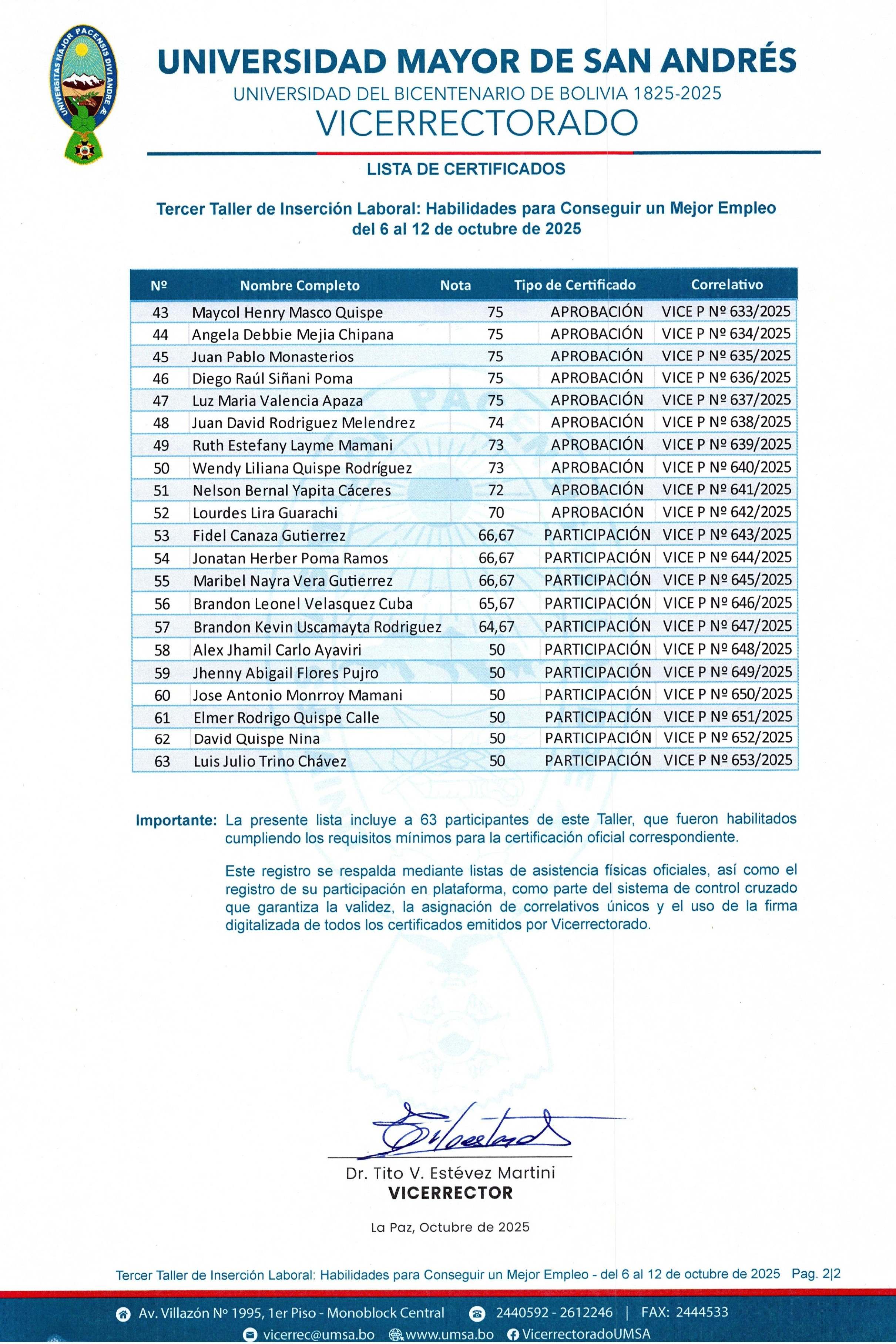 Se otorgarán certificados de aprobación emitidos por Vicerrectorado, con una carga horaria de 20 horas académicas siguiendo la siguiente escala: