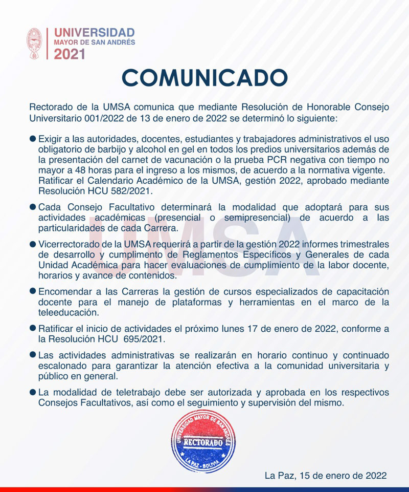 Rectorado de la UMSA comunica que mediante Resolución de Honorable Consejo Universitario 001/2022 de 13 de enero de 2022 se determinó lo siguiente: