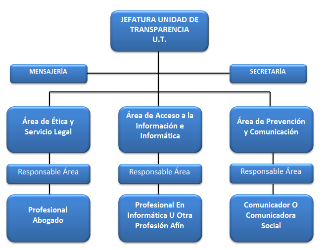 La estructura organizativa de la Unidad de Transparencia, refleja las funciones y atribuciones otorgadas por su marco legal constitutivo. Se organiza a través de Áreas de trabajo, a las cuales se les asigna responsabilidades principales y complementarias, permitiendo un trabajo articulado entre cada una de ellas.