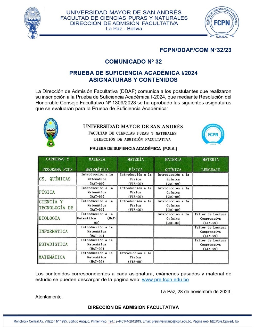 CONVOCATORIA PRUEBA DE SUFICIENCIA ACADÉMICA - FACULTAD DE CIENCIAS PURAS Y NATURALES - ADMISIÓN ACADÉMICA 2024