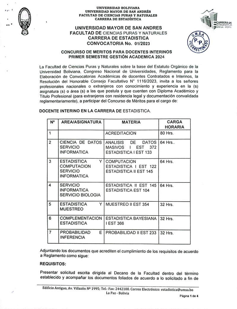 CONVOCATORIA CONCURSO DE MÉRITOS PARA DOCENTES INTERINOS PRIMER SEMESTRE - GESTIÓN ACADÉMICA 2024 - CARRERA DE ESTADÍSTICA