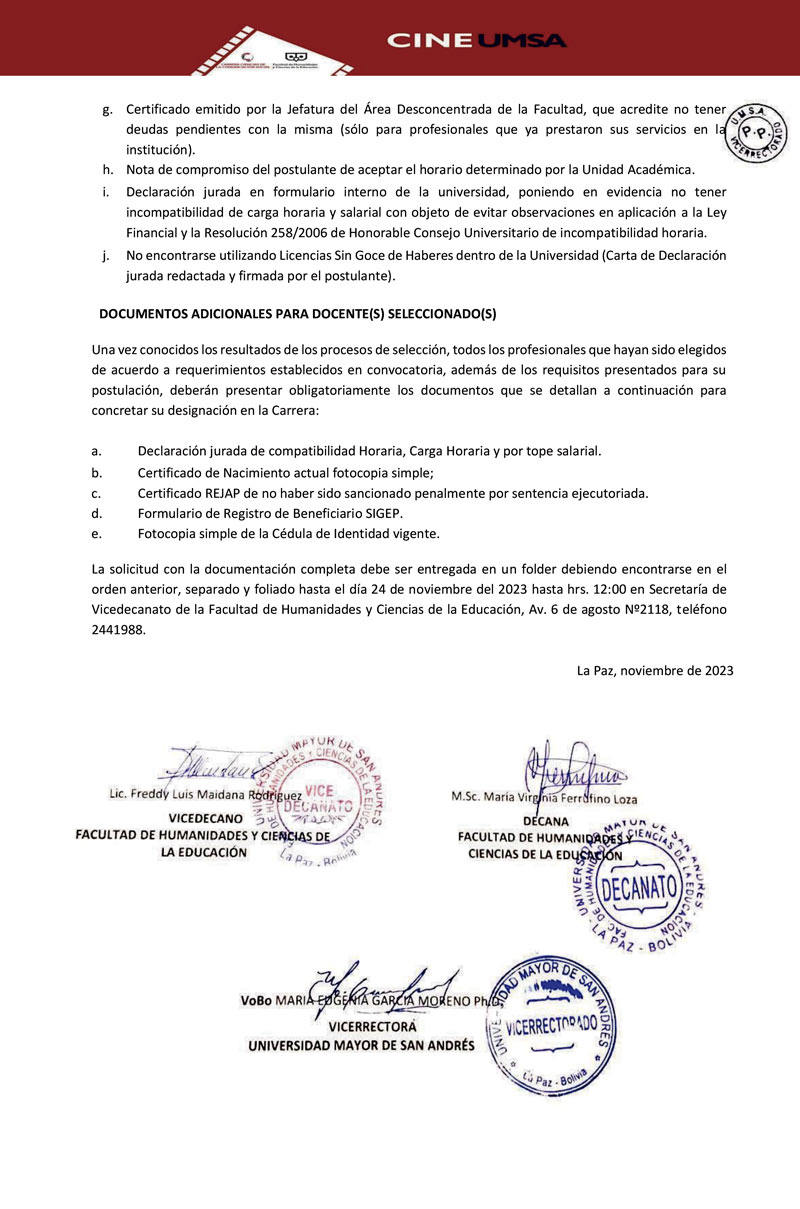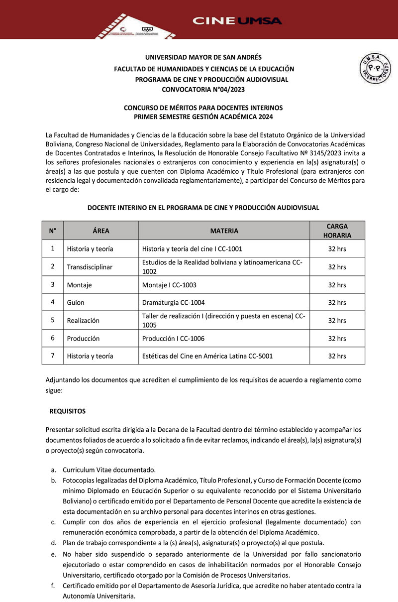 CONVOCATORIA CONCURSO DE MÉRITOS PARA DOCENTES INTERINOS - PROGRAMA DE CINE Y PRODUCCIÓN AUDIOVISUAL (PRIMER SEMESTRE - GESTIÓN ACADÉMICA 2024)