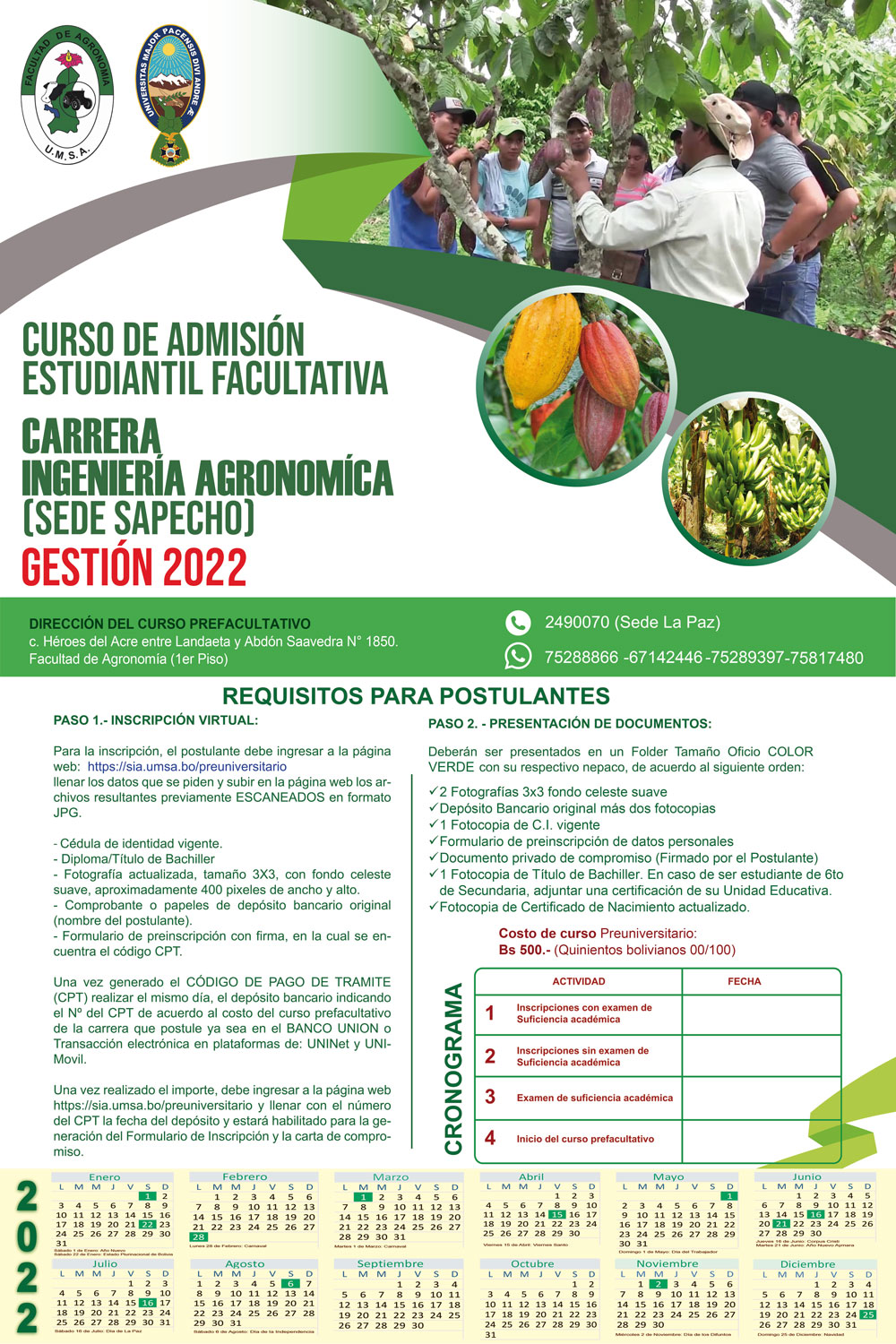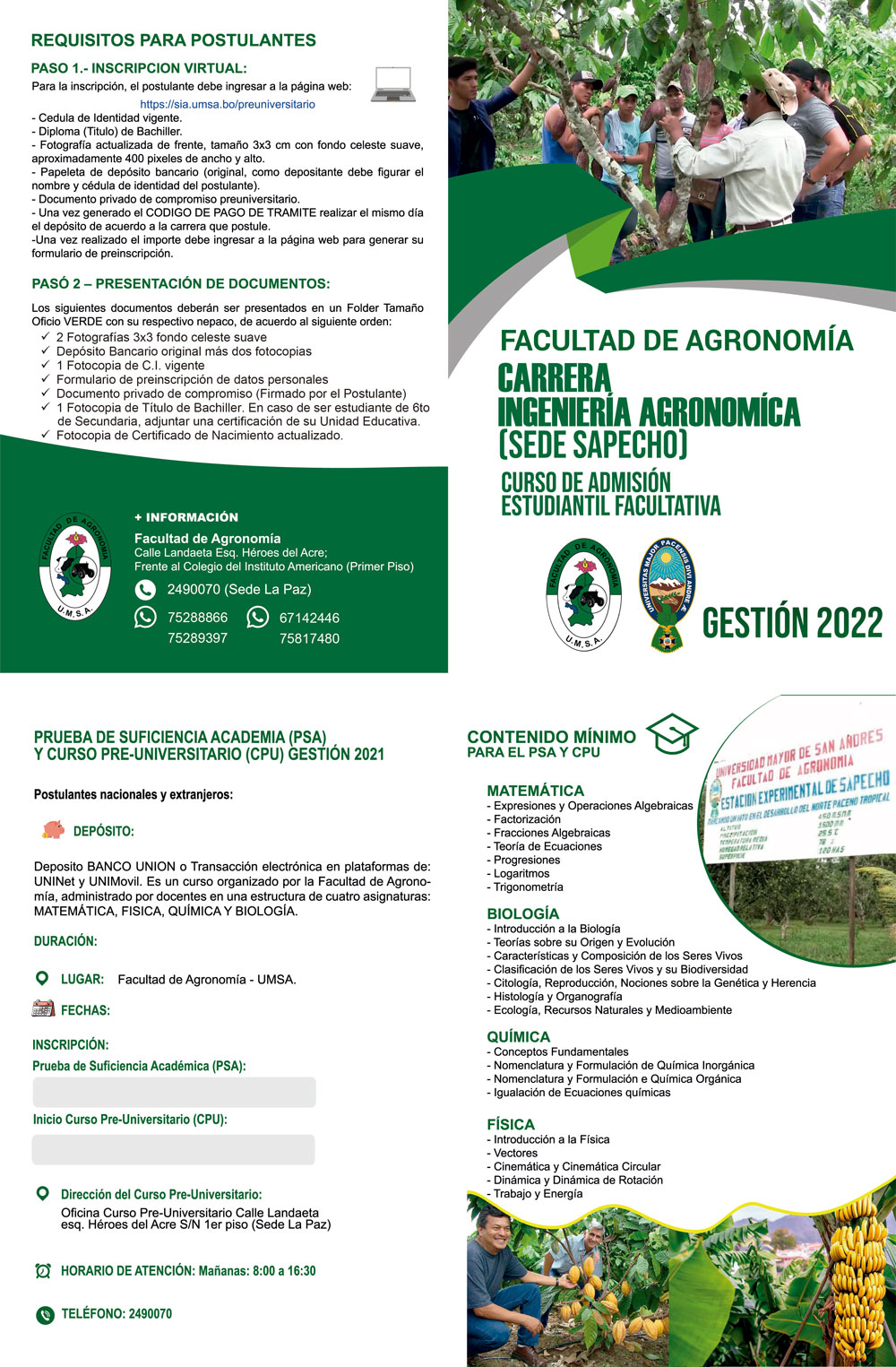 La Facultad de Agronomía invita a bachilleres, al Curso de Admisión Estudiantil Facultativa para el Programa de Carrera de INGENIERÍA AGRONÓMICA (SEDE SAPECHO).