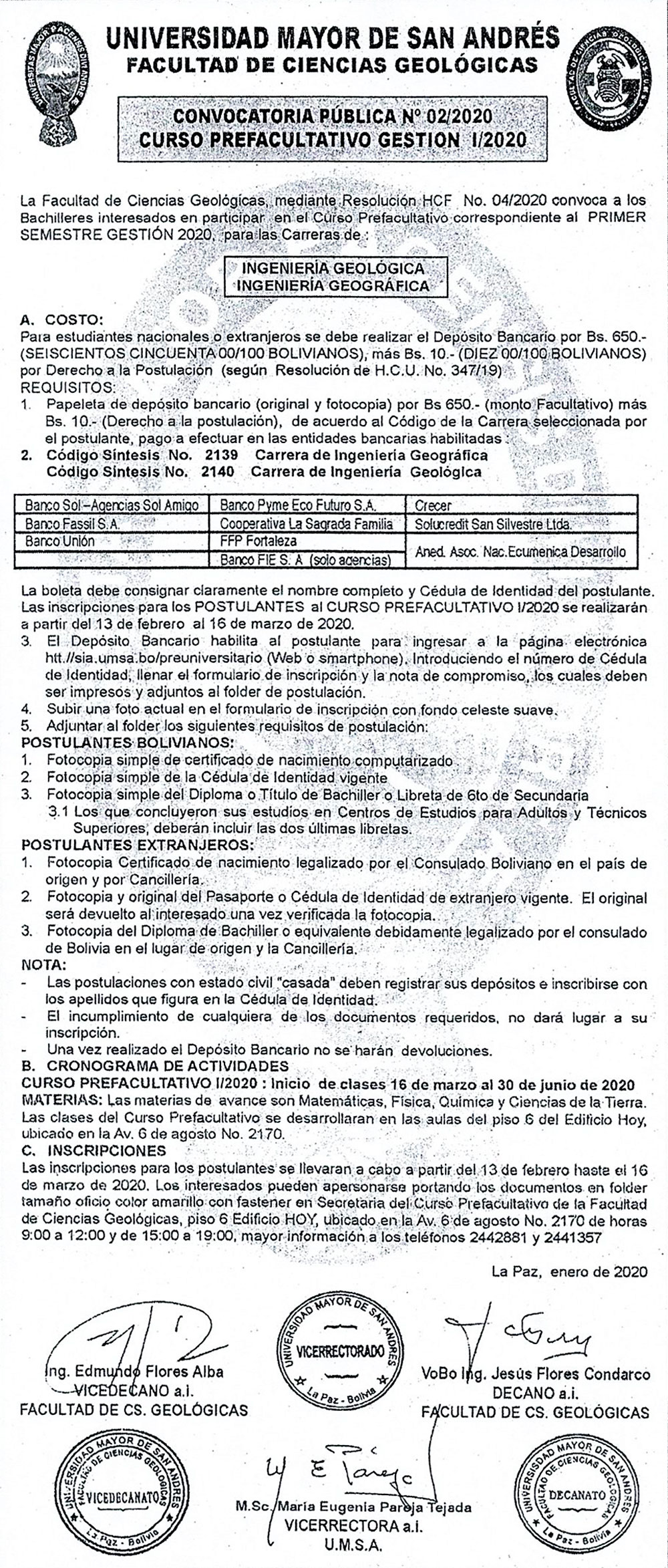 Las inscripciones para los postulantes se llevarán a cabo a partir del 13 de febrero hasta el 16 de marzo de 2020. Los interesados pueden apersonaras portando los documentos en toldes tamaño oficio color amarillo con fastener en Secretaria del Curso Prefacultativo de la Facultad de Ciencias Geológicas, piso 6 Edificio HOY, ubicado en la Av. de agosto No. 2170 de horas 9:00 a 12:00 y de 15:00 a 19:00, mayor información a los teléfonos 2442881 y 2441357