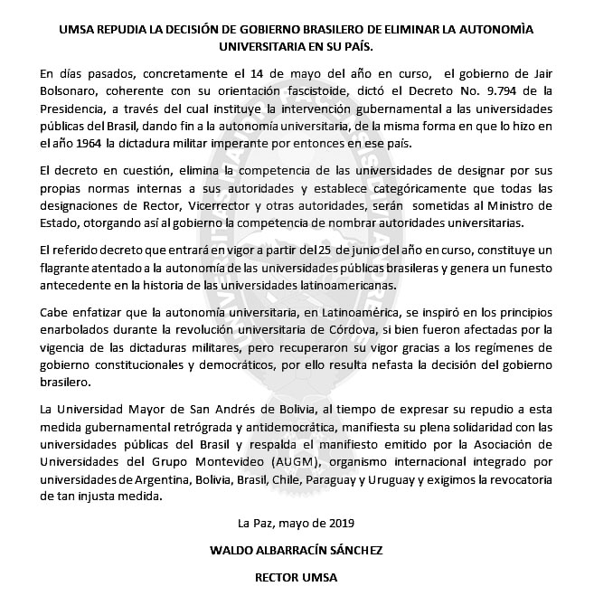 La Universidad Mayor de San Andrés de Bolivia, al tiempo de expresar su repudio a esta medida gubernamental retrógrada y antidemocrática, manifiesta su plena solidaridad con las universidades públicas del Brasil y respalda el manifiesto emitido por la Asociación de Universidades del Grupo Montevideo (AUGM), organismo internacional integrado por universidades de Argentina, Bolivia, Brasil, Chile, Paraguay y Uruguay y exigimos la revocatoria de tan injusta medida.