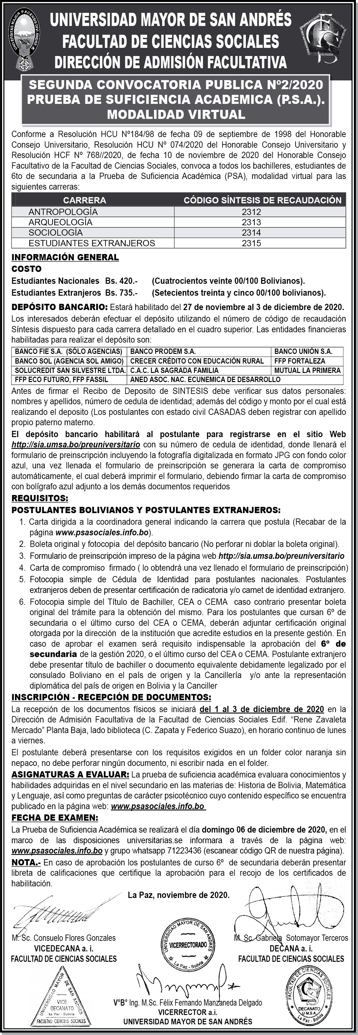 Dirección de Admisión Facultativa de la Facultad de Ciencias Sociales -UMSA Calle Federico Zuazo Edificio "Rene Zavaleta Mercado" Planta Baja.