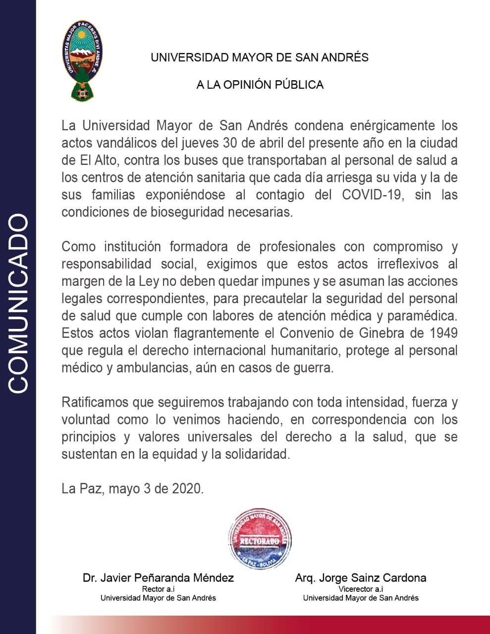 La Universidad Mayor de San Andrés condena enérgicamente los actos vandálicos del jueves 30 de abril del presente año en la ciudad de El Alto, contra los buses que transportaban al personal de salud a los centros de atención sanitaria que cada día arriesga su vida y la de sus familias exponiéndose al contagio del COVID-19, sin las condiciones de bioseguridad necesarias.