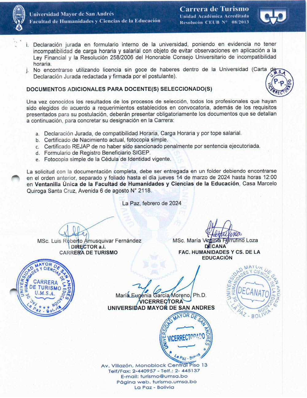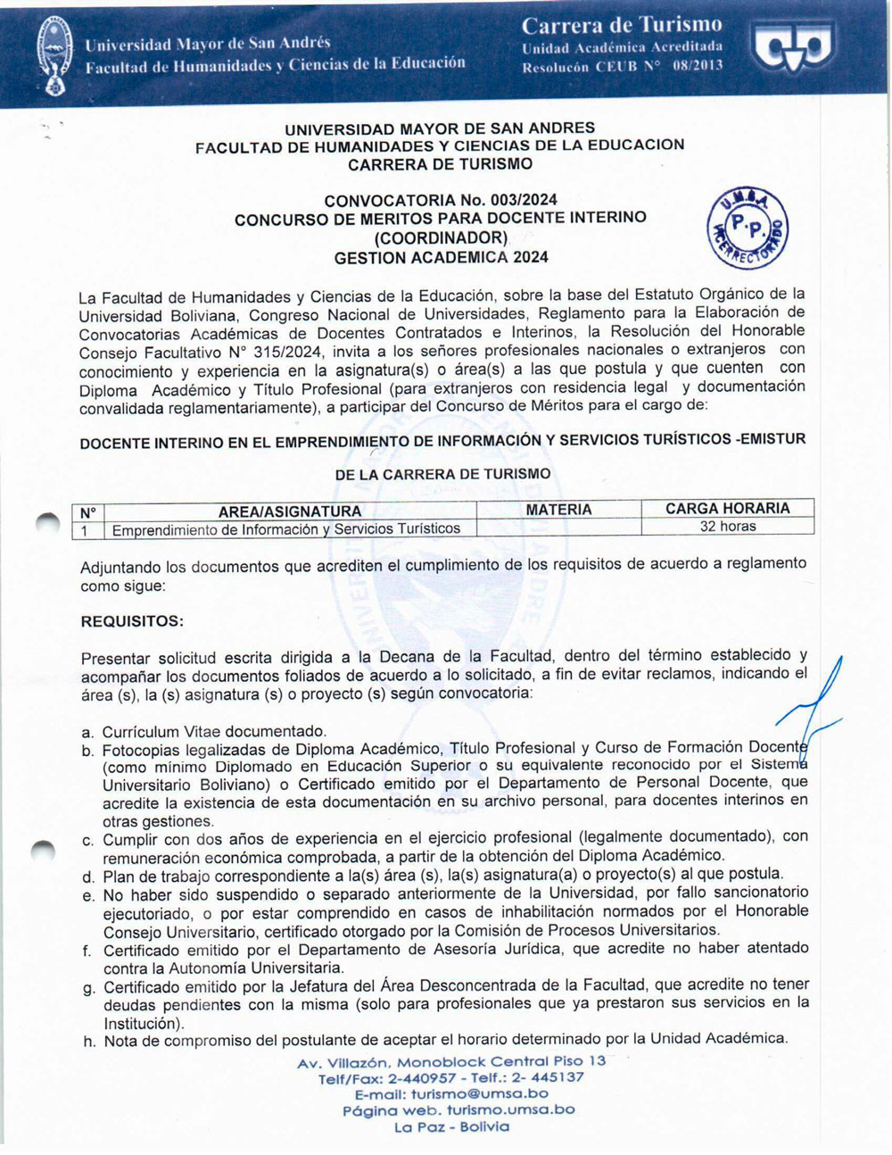 CONVOCATORIA CONCURSO DE MÉRITOS PARA DOCENTE INTERINO (COORDINADOR EMISTUR DE LA CARRERA DE TURISMO) GESTIÓN ACADÉMICA 2024