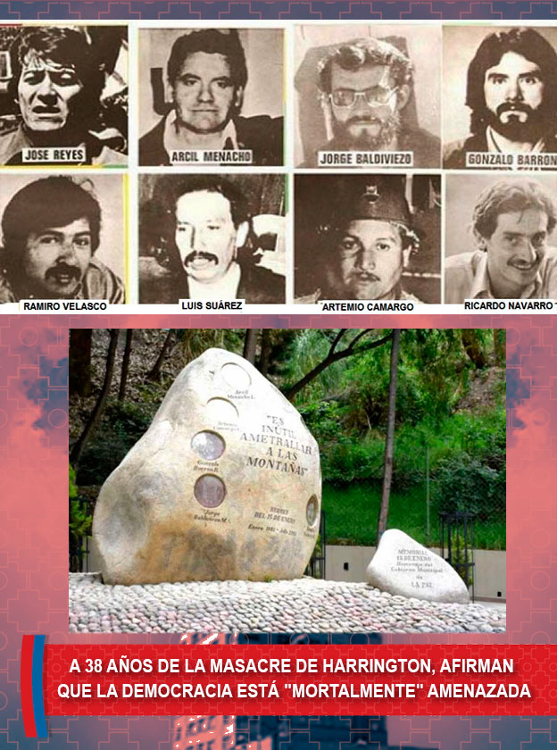 Hoy se cumplen 38 años de la masacre en la calle Harrington en el barrio de Sopocachi en La Paz. Como cada año, diferentes autoridades y políticos, por separado, rindieron homenaje a los "mártires" y afirmaron que en la actualidad, la democracia está amenazada por el gobierno del MAS.