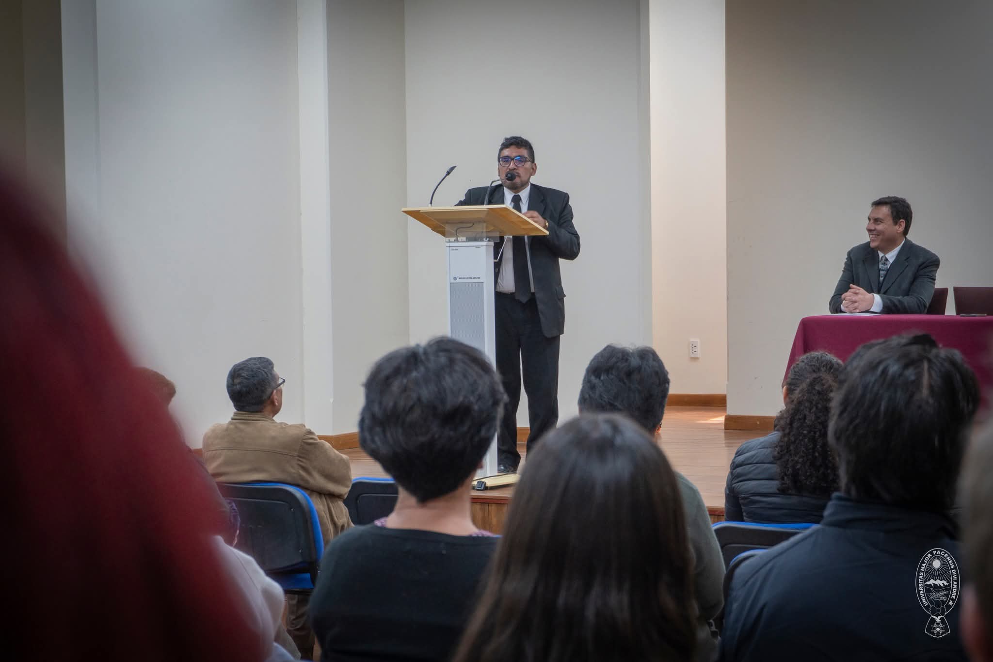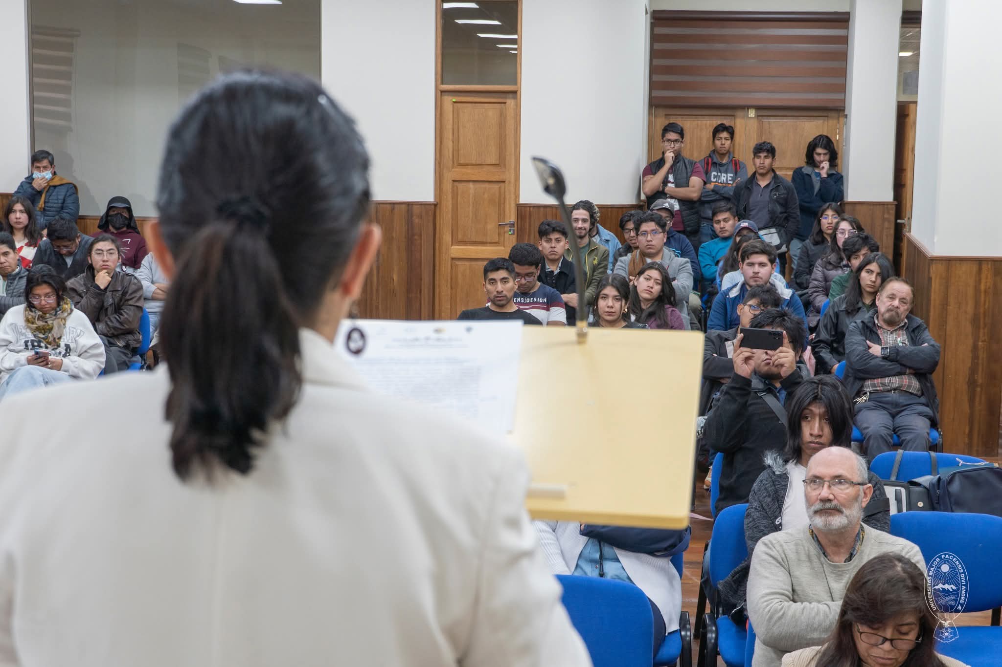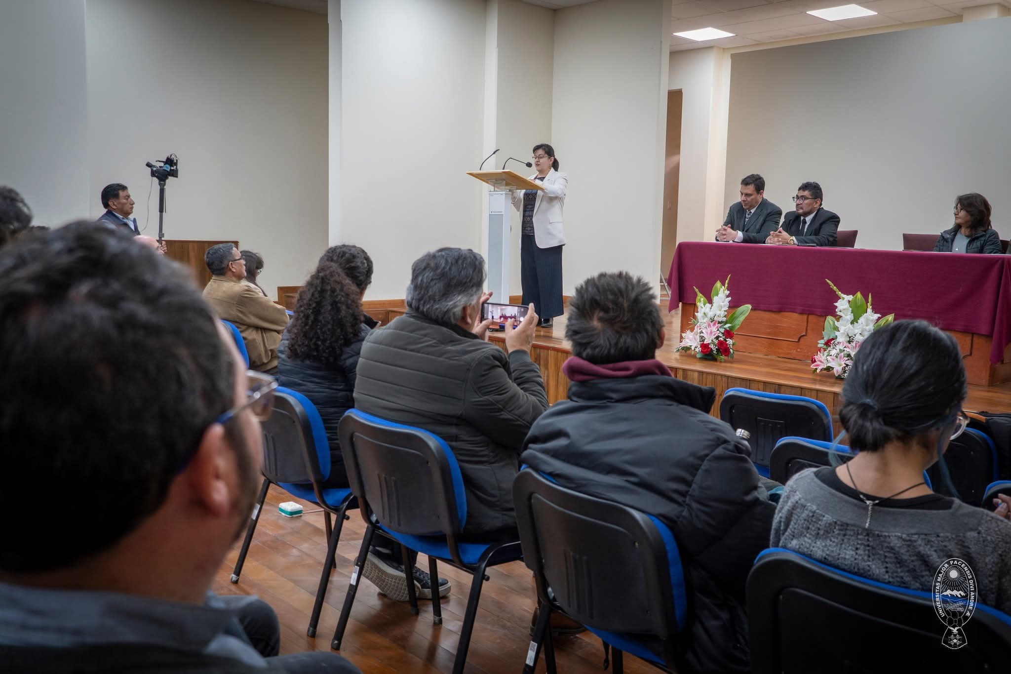 🎙 La jornada reunió a autoridades, docentes, estudiantes y personal administrativo. La Rectora, María Eugenia García Moreno, Ph.D., junto al Decano de la Facultad de Ciencias Puras y Naturales, M.Sc. Aldo Valdéz, anunciaron avances en la construcción del edificio de la Carrera de Física en la Ciudad Universitaria de Cota Cota.