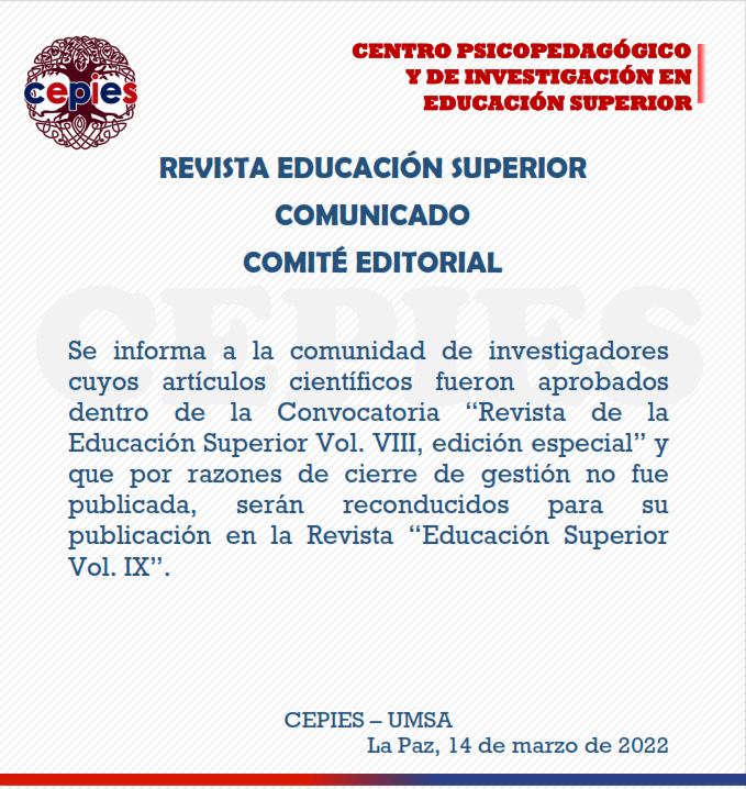 Se informa a la comunidad de investigadores cuyos artículos científicos fueron aprobados dentro de la Convocatoria “Revista de la Educación Superior Vol. VIII, edición especial” y que por razones de cierre de gestión no fue publicada, serán reconducidos para su publicación en la Revista “Educación Superior Vol. IX”.