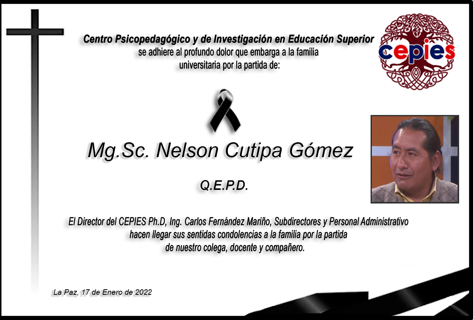 El director del CEPIES Ph.D Ing. Carlos Fernandez Mariño, Subdirectores y personal administrativo hacen llegar sus sentidas condolencias a la familia por la partida de nuestro colega, docente y compañero.
