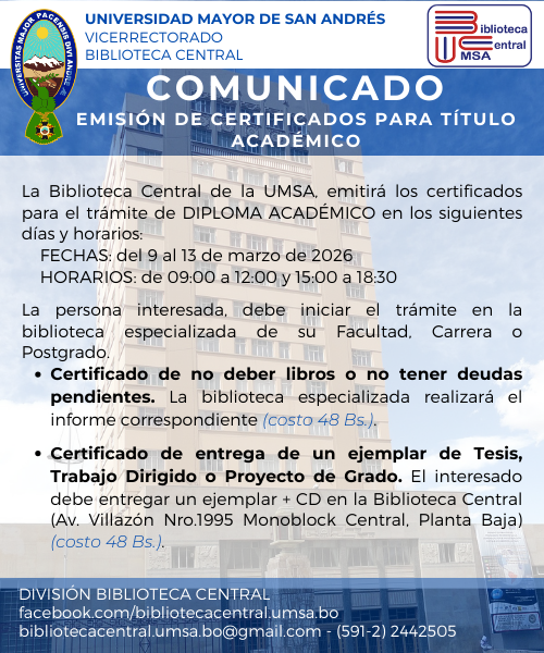 La Rectora, el Vicerrector y la Jefa de la División Biblioteca Central de la Universidad Mayor de San Andrés, tienen el agrado de invitar a Usted al Acto de "Aniversario de la Biblioteca Central" y "Presentación del Documento Capitulación de Tumusla", a llevarse a cabo el día jueves 20 de marzo, a hrs. 10:00 en la Sala de Lectura de la Biblioteca Central UMSA, Planta Baja del Monoblock, Av. Villazón No 1995.