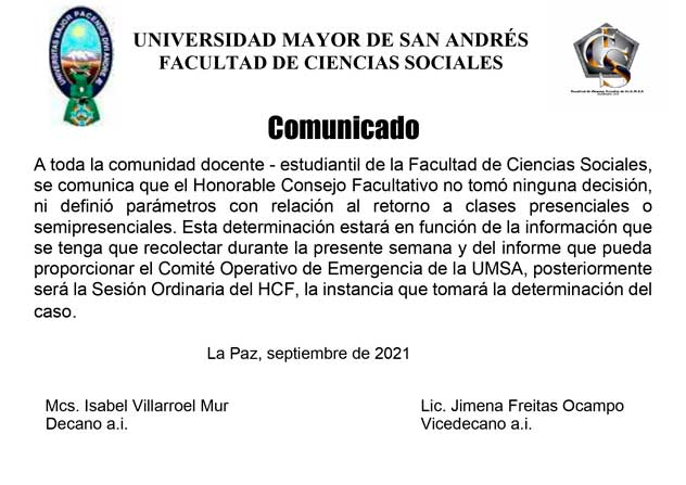 A tiempo de saludarlo muy cordialmente, con el objetivo de contar con una base de datos sobre los factores de riesgo de los docentes, administrativos y estudiantes de la UMSA en relación a COVID-19, para poder percibir la magnitud de la afectación en cada estamento y facilitar la planificación de medidas institucionales administrativas y preventivas, es que el COE UMSA le solicita compartir los siguientes enlaces por los diferentes grupos de whatsapp o correos electrónicos, tanto de docentes, administrativos como estudiantes de la carrera de que usted dirige, los enlaces son los siguientes: