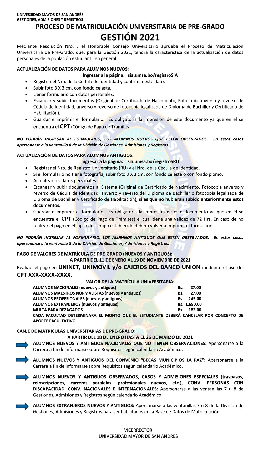 CANJE DE MATRICULA ESTUDIANTES REGULARES A PARTIR DEL LUNES 1 DE MARZO