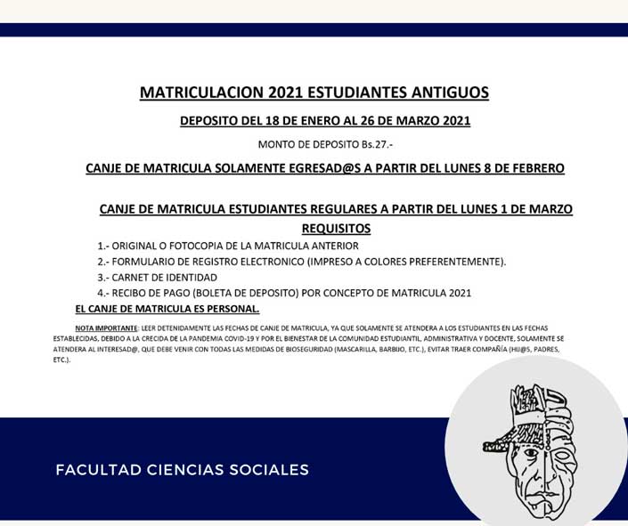 LEER DETENIDAMENTE LAS FECHAS DE CANJE DE MATRICULA, YA QUE SOLAMENTE SE ATENDERA A LOS ESTUDIANTES EN LAS FECHAS ESTABLECIDAS, DEBIDO A LA CRECIDA DE LA PANDEMIA COVID-19 Y POR EL BIENESTAR DE LA COMUNIDAD ESTUDIANTIL, ADMINISTRATIVA Y DOCENTE, SOLAMENTE SE ATENDERA AL INTERESAD@, QUE DEBE VENIR CON TODAS LAS MEDIDAS DE BIOSEGURIDAD (MASCARILLA, BARBIJO, ETC.), EVITAR TRAER COMPAÑÍA (HIJ@S, PADRES, ETC.).