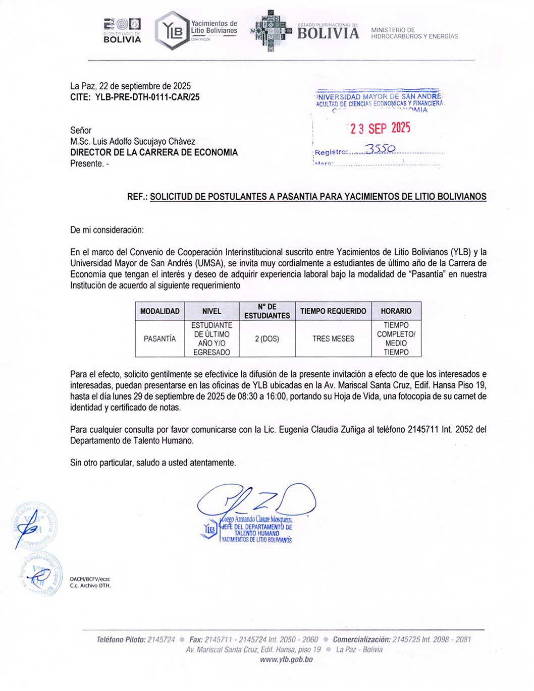 📌SOLICITUD DE POSTULANTES A PASANTIA PARA YACIMIENTOS DE LITIO BOLIVIANOS - CARRERA ECONOMÍA