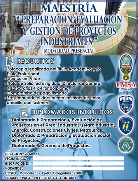 El Programa de Maestría en Preparación, Evaluación y Gestión de Proyectos Industriales, surge en respuesta a una demanda social que requiere talento humano especializado en el ciclo de gestión de proyectos desde su preparación y gestión. El sector púbico, el sector privado así como las organizaciones no gubernamentales, han abierto espacios para los profesionales que posean herramientas y aptitudes que incentiven la innovación a nivel de procesos y de proyectos.