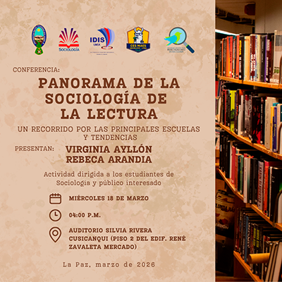 El miércoles 18 de marzo, a las 16.00, Virginia Ayllón y Rebeca Arandia darán la conferencia: “Panorama de la sociología de la lectura. Un recorrido por las principales escuelas y tendencias”. La actividad se realizará en el auditorio Silvia Rivera (segundo piso del edificio René Zavaleta, en el segundo patio del monoblock de la UMSA; ingreso por la calle Federico Zuazo), y está dirigida a estudiantes de Sociología y público interesado. El evento es organizado por el Instituto de Investigaciones Sociológicas “Mauricio Lefebvre”, el Centro de Estudiantes de la carrera de Sociología de la UMSA  y la Sociedad Científica de Investigadores en Sociología.