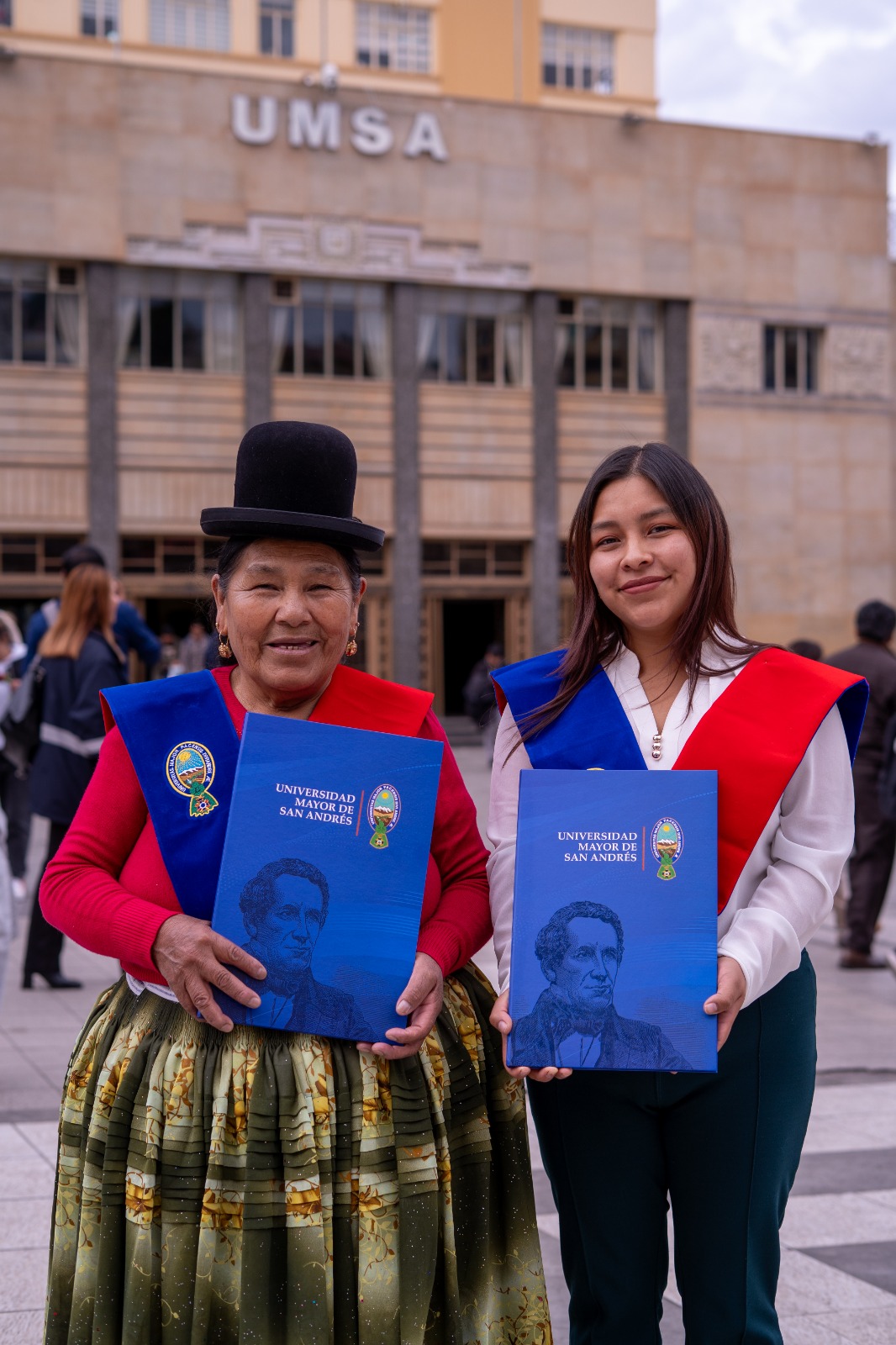 La Paz, 12 de marzo de 2026 (DCOM-UMSA).- Lo que para muchos puede ser solo una fotografía de graduación, para Eulogía Condori representa una victoria personal. A sus 71 años, levantó su título con orgullo en el Paraninfo de la Universidad Mayor de San Andrés, donde se tituló junto a su hija Camila Soldado Condori, tras una vida marcada por el esfuerzo y la perseverancia.