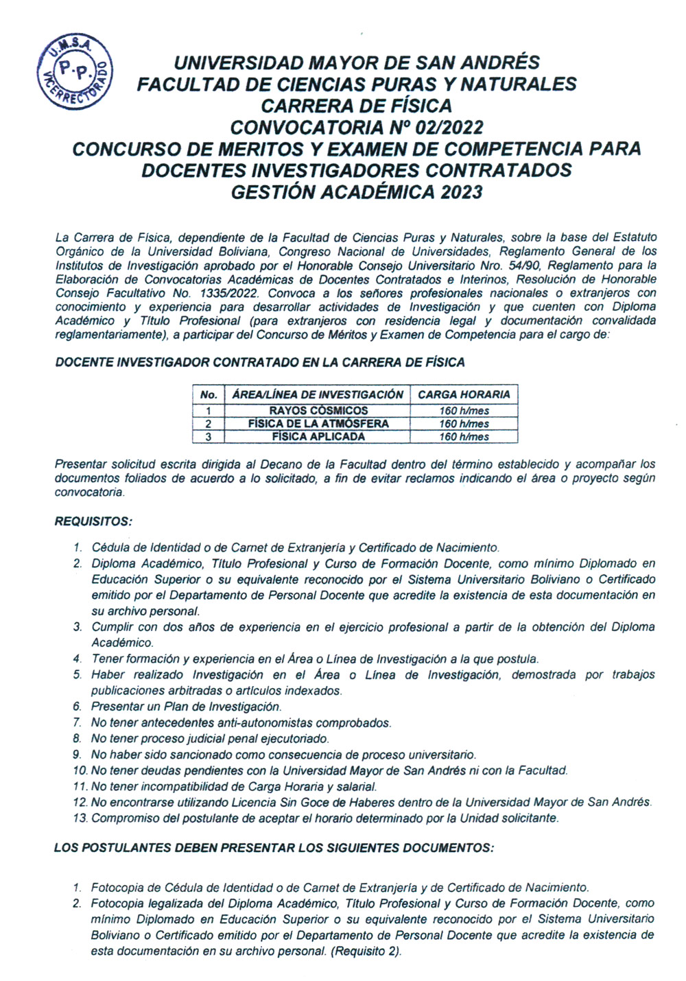 CARRERA DE FÍSICA CONVOCATORIA CONCURSO DE MERITOS Y EXAMEN DE COMPETENCIA PARA DOCENTES INVESTIGADORES CONTRATADOS - GESTIÓN ACADÉMICA 2023