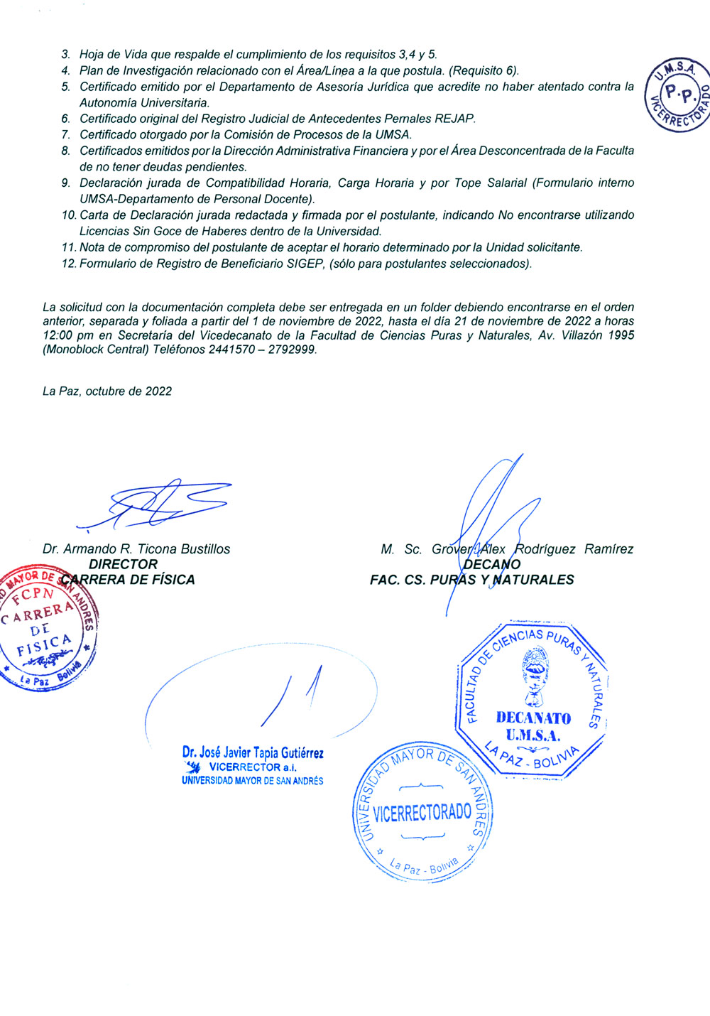 La carrera de Física, dependiente de la Facultad de Ciencias Puras y Naturales de la #UMSA, invita a profesionales nacionales y extranjeros con conocimiento y experiencia, a participar del concurso de méritos para: