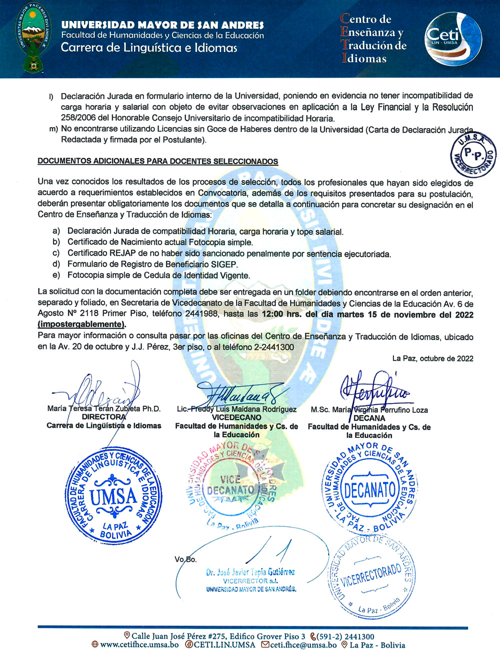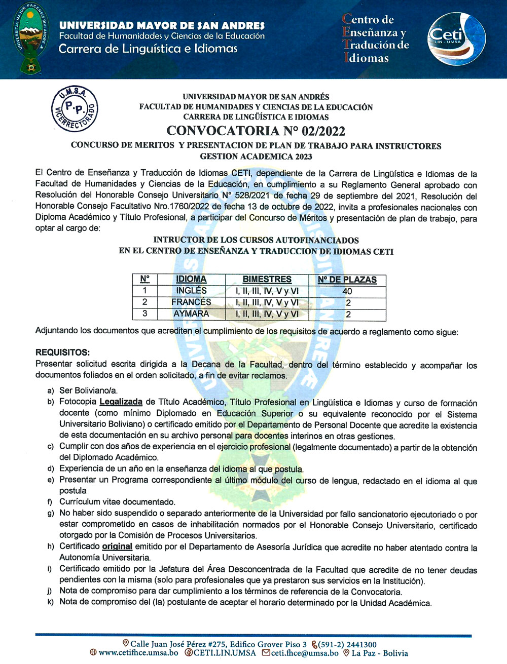 El Centro de Enseñanza y Traducción de Idiomas (CETI), dependiente de la Carrera de Lingüística e Idiomas de la #UMSA invita a profesionales nacionales y extranjeros con conocimiento y experiencia, a participar del concurso de méritos y presentación del plan de trabajo para: