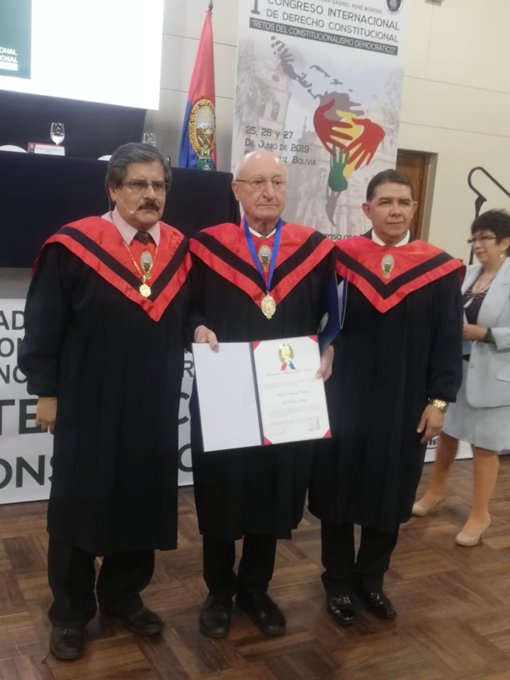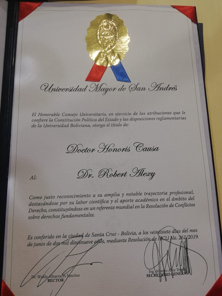 El dia Jueves 27 de Junio del presente año se efectuó la solemne ceremonia de honor de Imposición de la Medalla y entrega del título de Doctor Honoris Causa por la Universidad Mayor de San Andrés al Dr. Robert Alexy, destacado jurista alemán y catedrático de Derecho Público de la Universidad Christian-Albrechts de Kiel en el Salón Exhibición del Hotel Los Tajibos de la ciudad de Santa Cruz, en el marco del 1er Congreso Internacional de Derecho Constitucional
