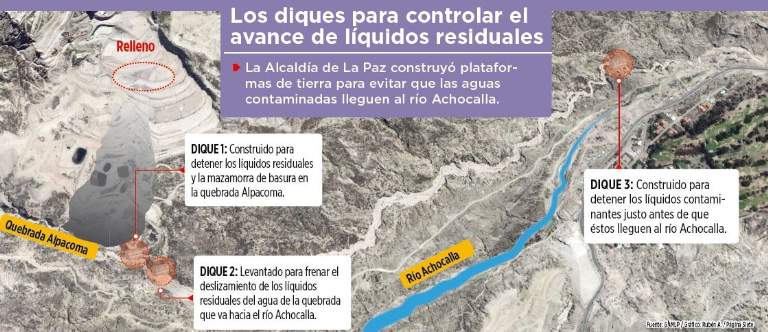 Por las lluvias, se refuerzan los trabajos en los diques y canalizaciones que separan los lixiviados liberados por el colapso de Alpacoma de las aguas que fluyen por la quebrada de Alpaco y que desembocan en el río Achocalla. Los vecinos temen que las precipitaciones afecten los desvíos con los que la comuna evita la contaminación de los afluentes.