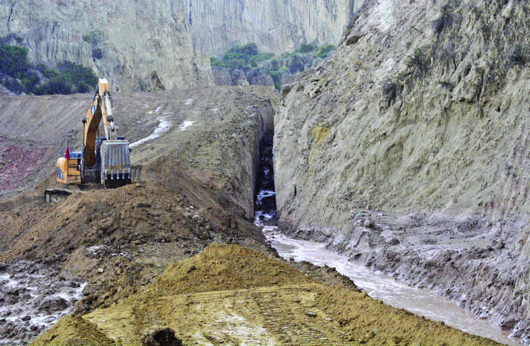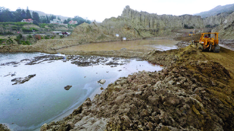 En la parte baja de la quebrada de Alpaco está el tercer dique (ver infografía) construido por la Alcaldía para frenar el avance del derrame de lixiviados. Dista poco más de dos kilómetros de la celda que sufrió el colapso, según evidenció Página Siete en una visita.