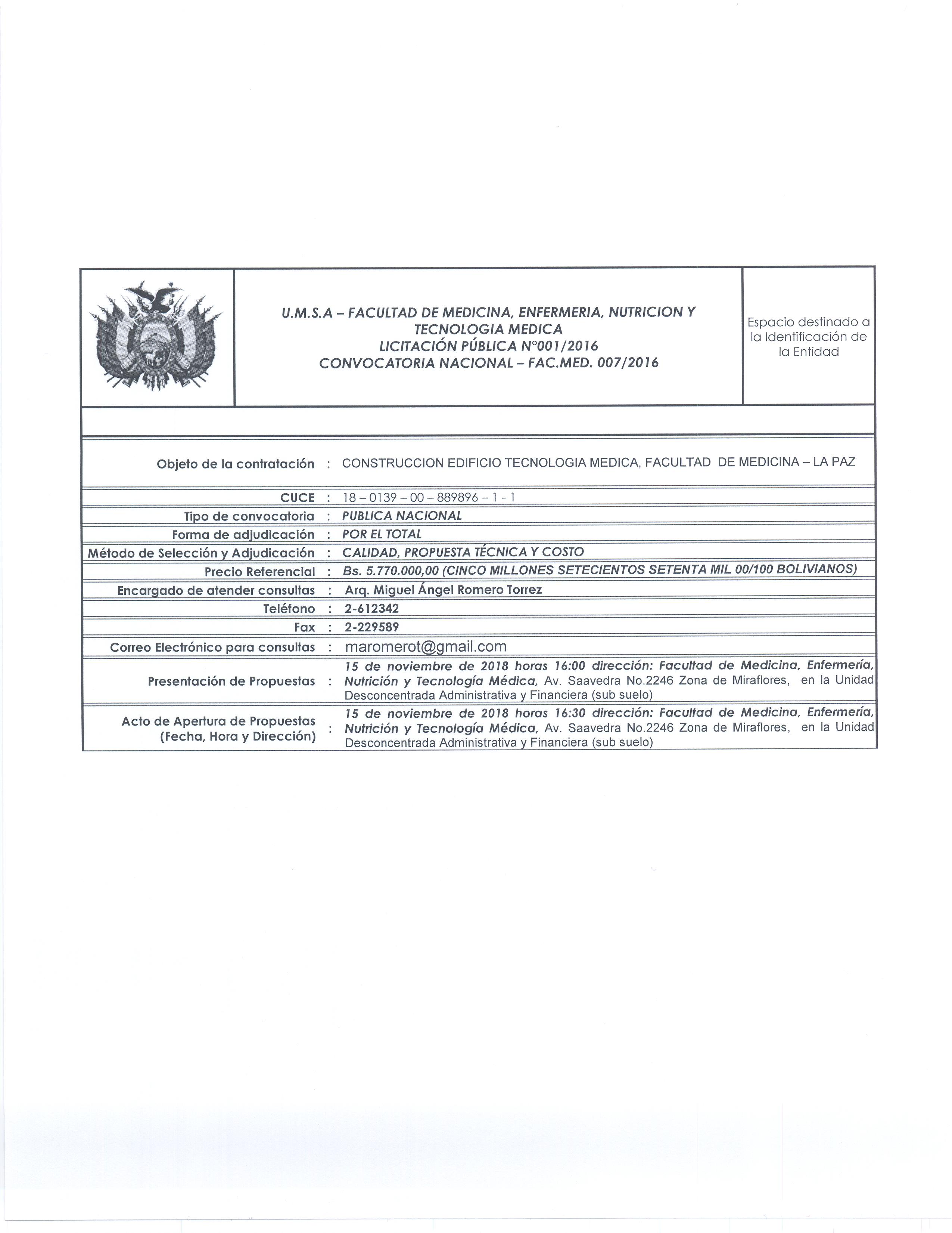 Nuevo monto destinado para la culminacion de la construcción del nuevo edificio de tecnología médica facultad de medicina - UMSA